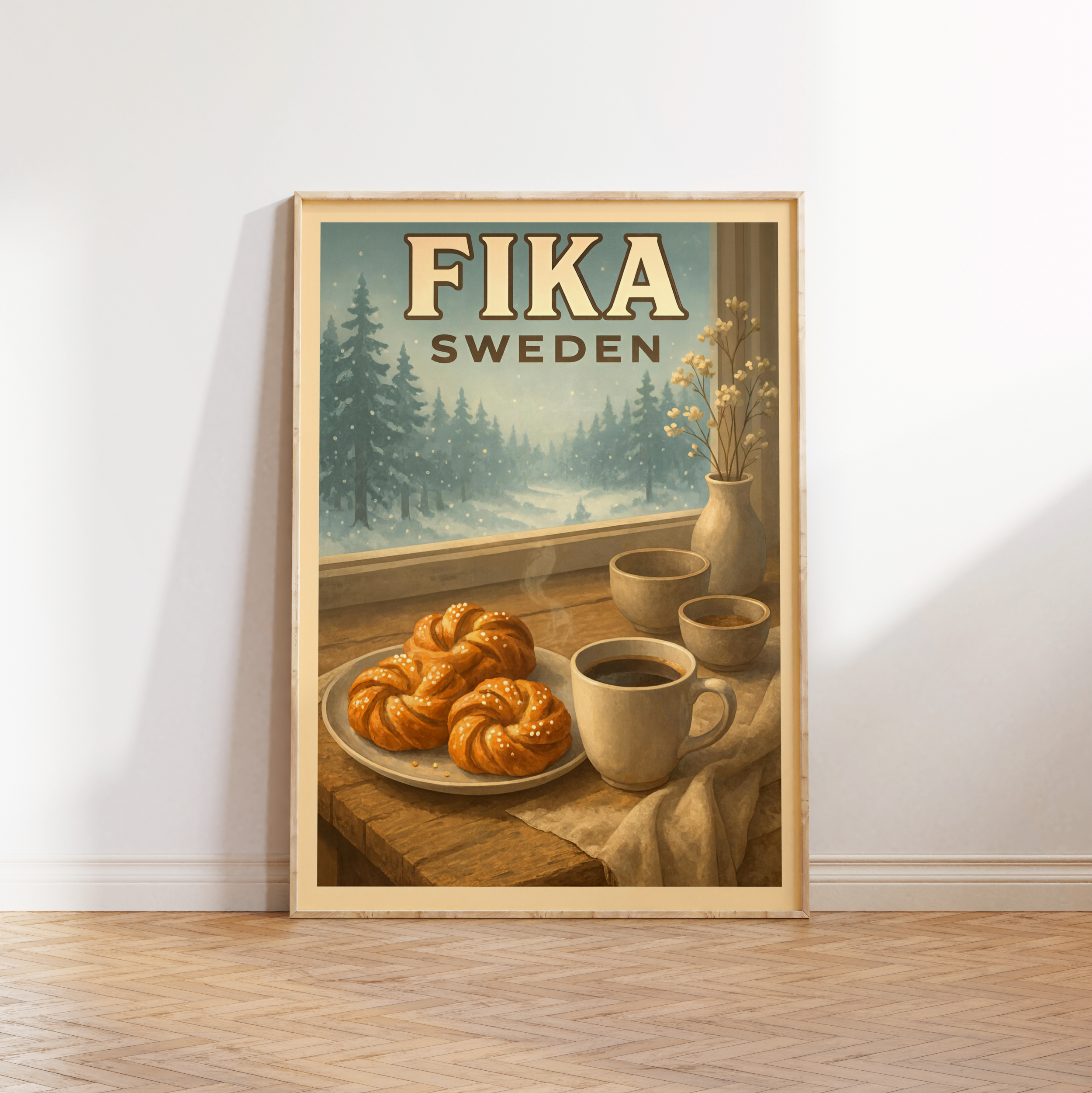 Plongez dans l'art de vivre suédois avec cette affiche chaleureuse et vintage célébrant le moment sacré du fika – une pause café accompagnée de délicieuses brioches à la cannelle, les kanelbullar. Sur fond de forêt enneigée et de lumière douce, cette illustration invite à la détente, au partage et à la simplicité nordique.