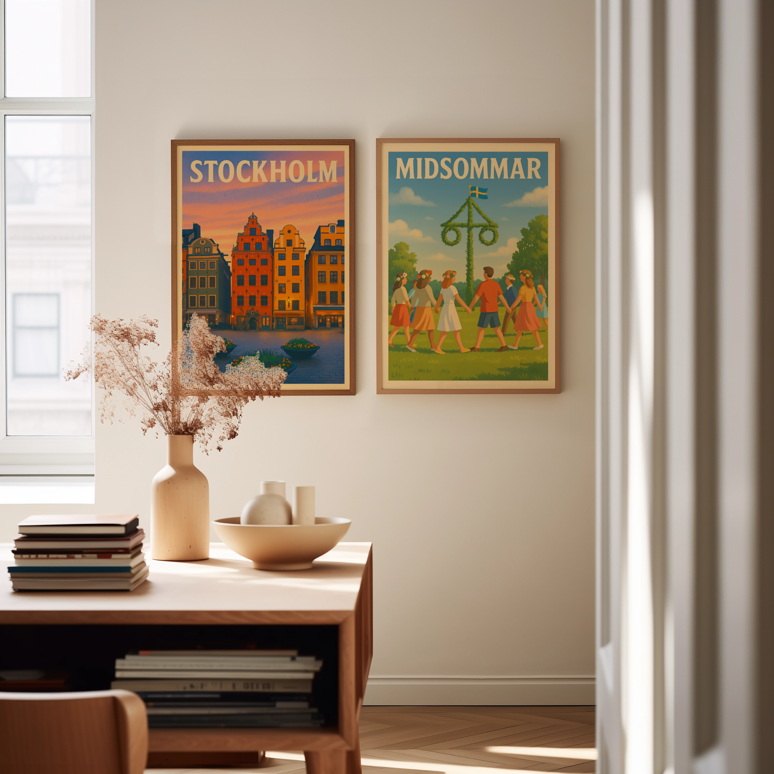 Célébrez la magie du solstice d'été suédois avec cette affiche inspirée des traditions de Midsommar : couronnes de fleurs, prairies ensoleillées, ciel pastel et nature en pleine renaissance. Une scène empreinte de douceur et de nostalgie, capturant l'esprit des longues journées boréales où le soleil ne se couche presque plus.