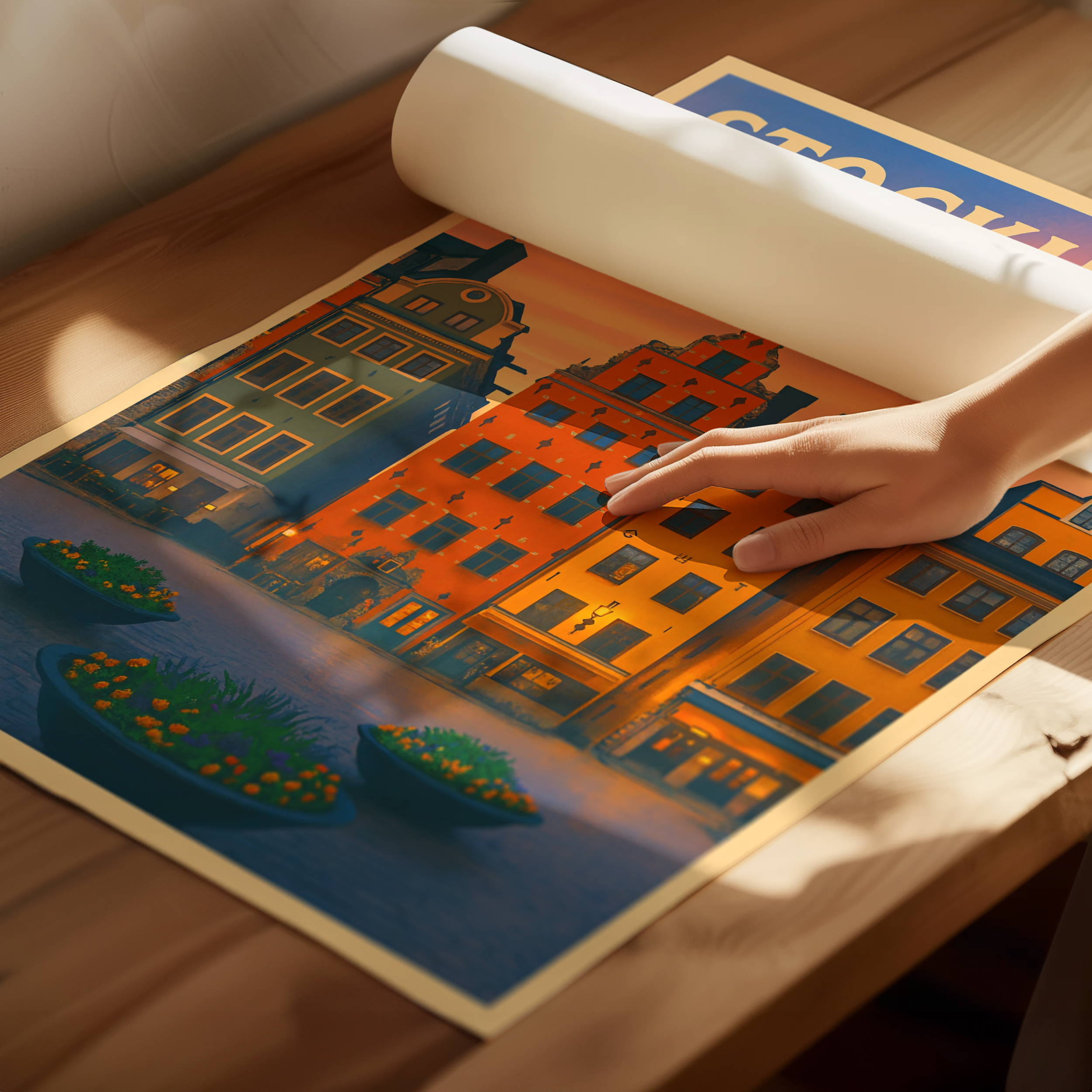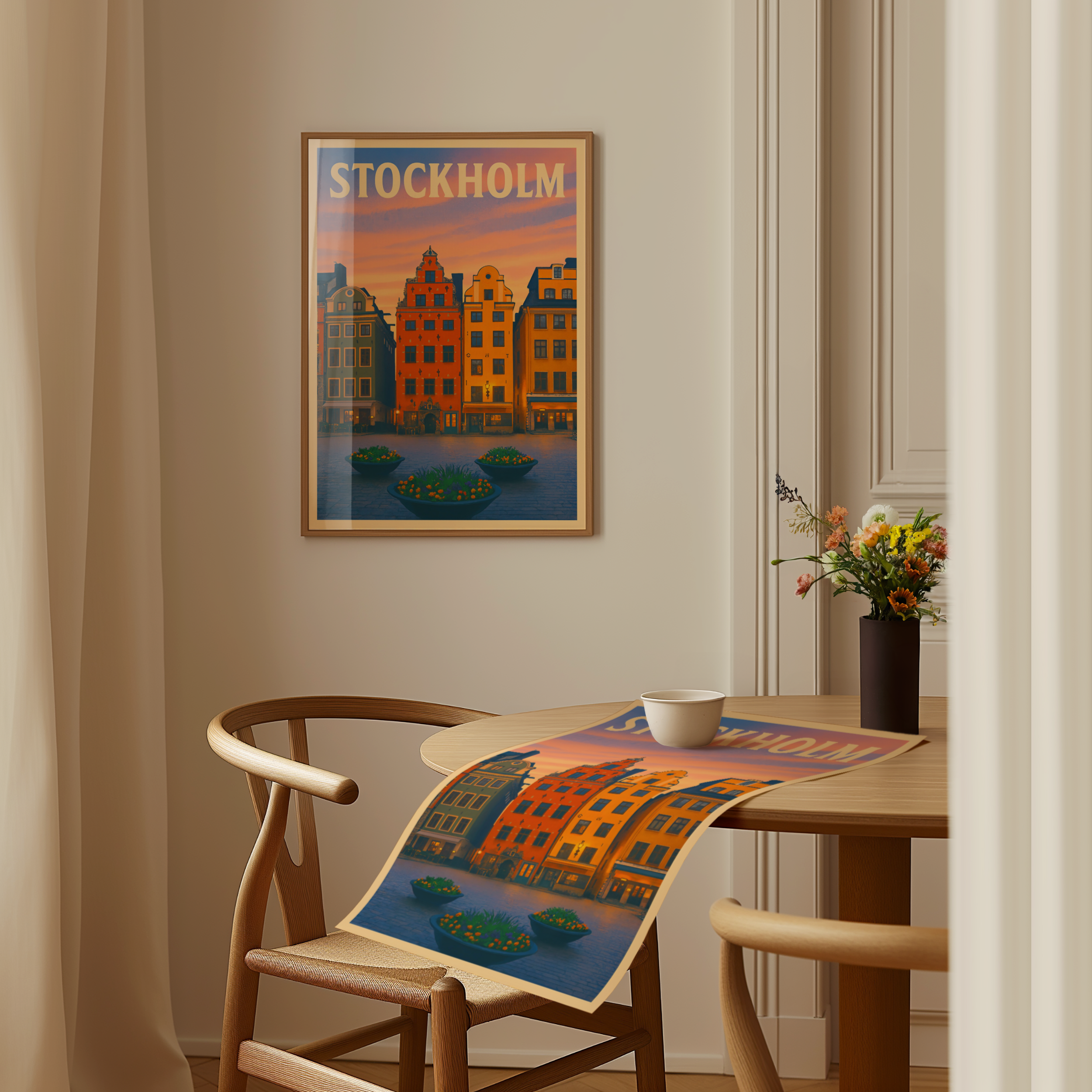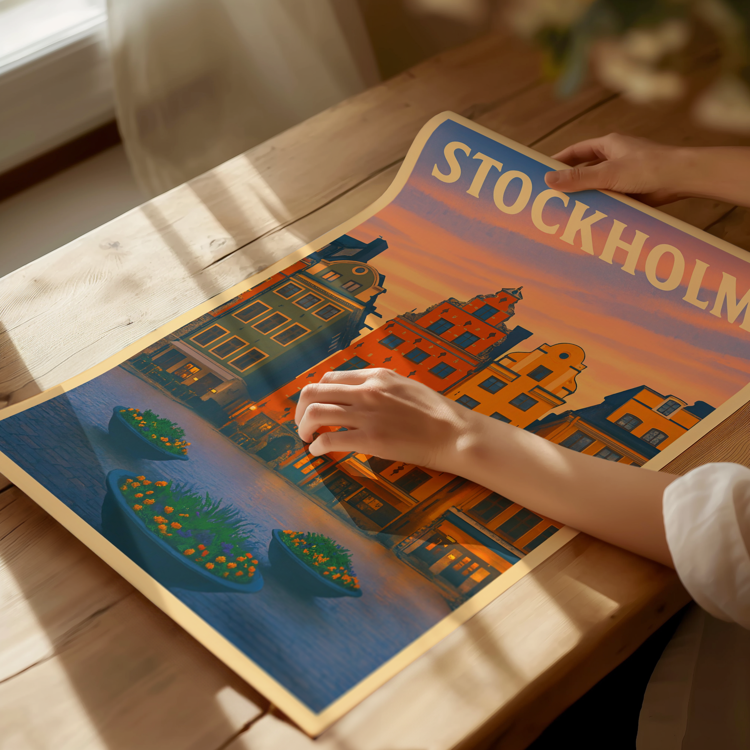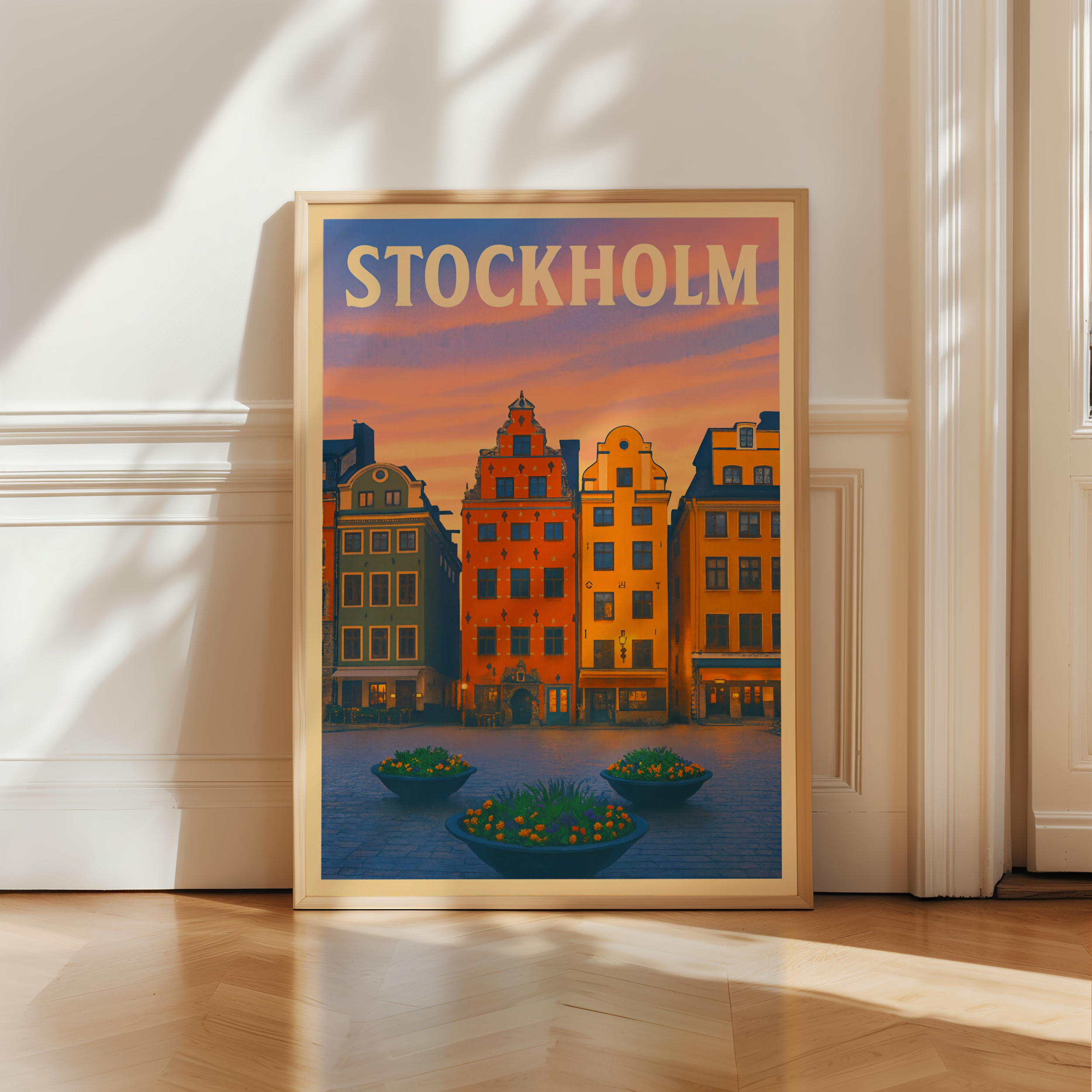 Plongez dans l’âme historique de la capitale suédoise avec cette affiche illustrée de Gamla Stan, le cœur coloré et pittoresque de Stockholm. Ses célèbres maisons aux façades ocre, rouge et jaune se dressent fièrement autour des ruelles pavées de la vieille ville, capturées ici dans un style travel poster vintage chaleureux et plein de charme. Le coucher de soleil scandinave ajoute une touche de douceur au décor nordique.